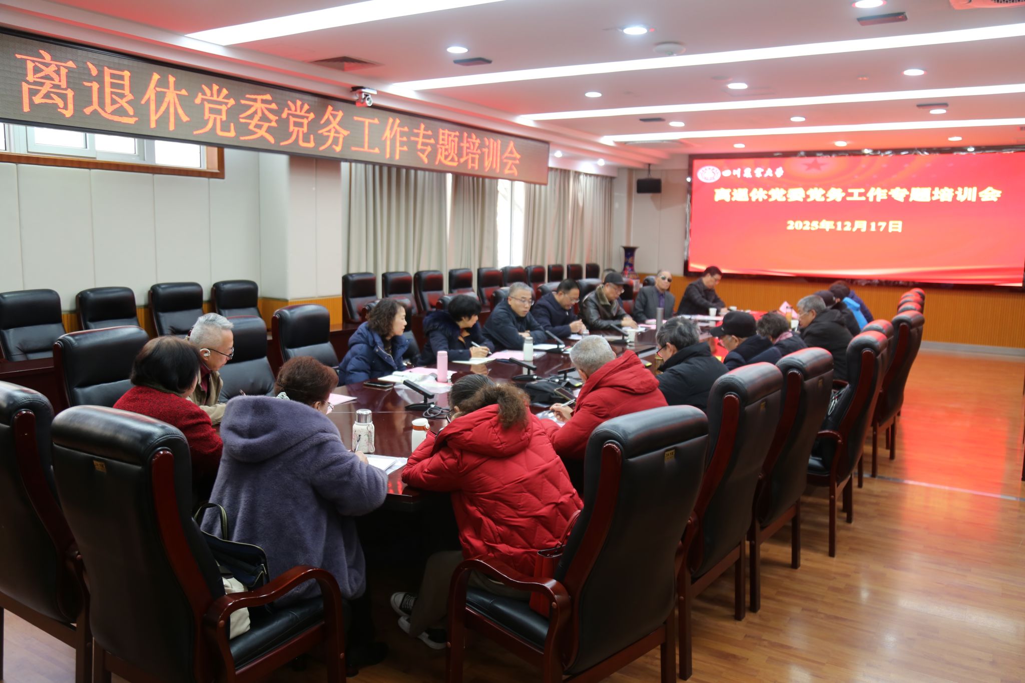 12月17日,离退休党委党务工作专题培训会议在雅安校区召开,深入学习贯彻党的创新理论,进一步加强离退休党建工作规范化建设,凝聚“银发力量”助力学校高质量发展。离退休党委委员、纪委委员,各党支部书记、支部委员,以及三校区离退休工作人员参加培训会。会议由离退休党委副书记、纪委书记尹君主持。